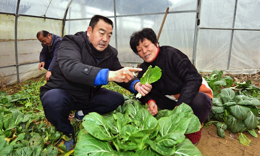 王龙民(左一)从小生长在农村,他在农作物生长方面算得上是一位“土专家”,菜农们遇到问题,总爱找他寻求解决方法。
