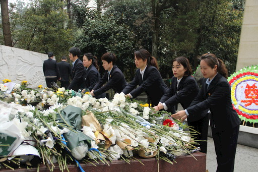 安吉县支行的党员们向革命先烈献花。