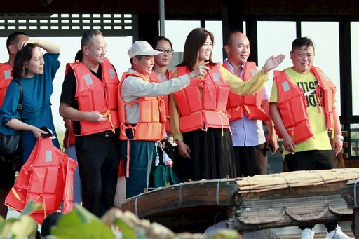 向游客介绍洪泽湖风光。