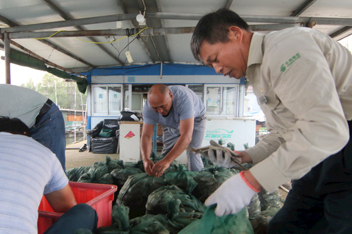 帮渔民捆扎大闸蟹。