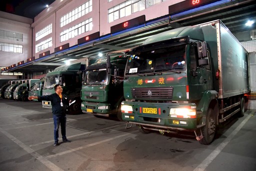 11月11日凌晨,湖北省武汉邮区中心局调度员杨成刚忙着指挥车辆进出垛口。 □郝振宁  摄影报道