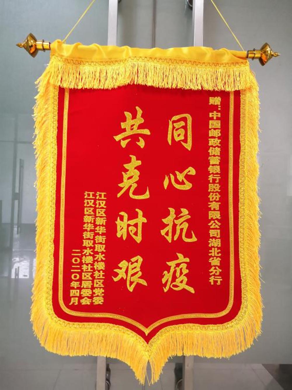 近日,江汉区新华路取水楼社区授予邮储银行湖北省分行党员突击二队“抗疫”锦旗,表彰其在疫情期间与广大社区居民“同心抗疫、共克时艰”的特殊贡献。