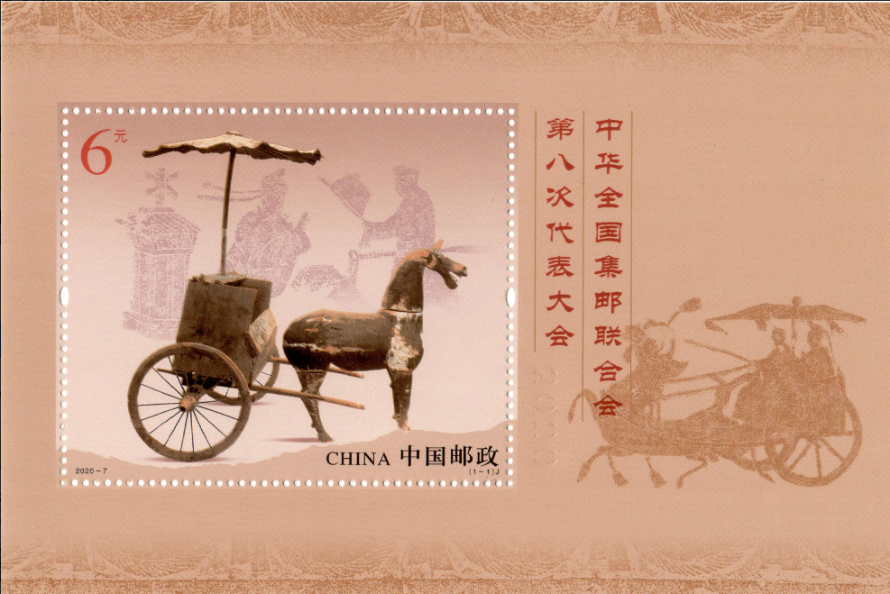 为庆祝中华全国集邮联合会第八次代表大会召开,弘扬新时代集邮文化,中国邮政定于2020年6月18日发行《中华全国集邮联合会第八次代表大会》纪念邮票(小型张)一套1枚,面值为6.00元,计划发行数量为600万套。邮票图案以青海省博物馆馆藏汉代木轺车为主要表现元素。该文物在1977年夏季出土于青海省西宁市城西彭家寨汉墓。