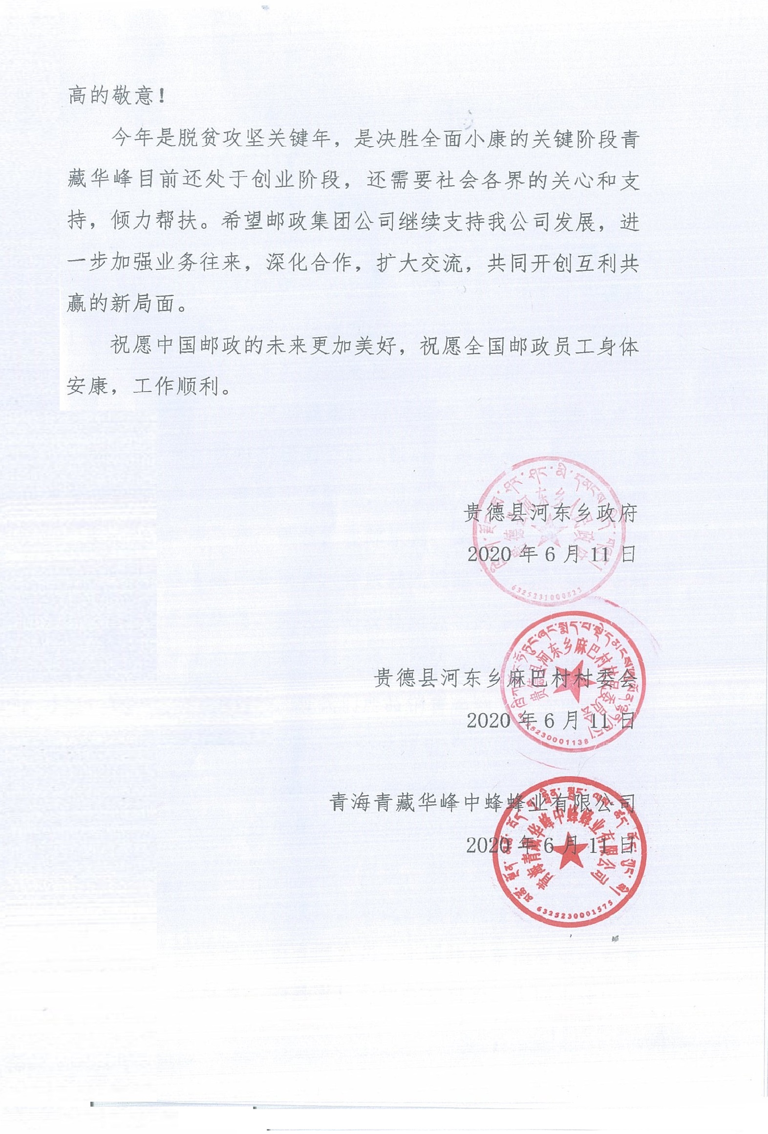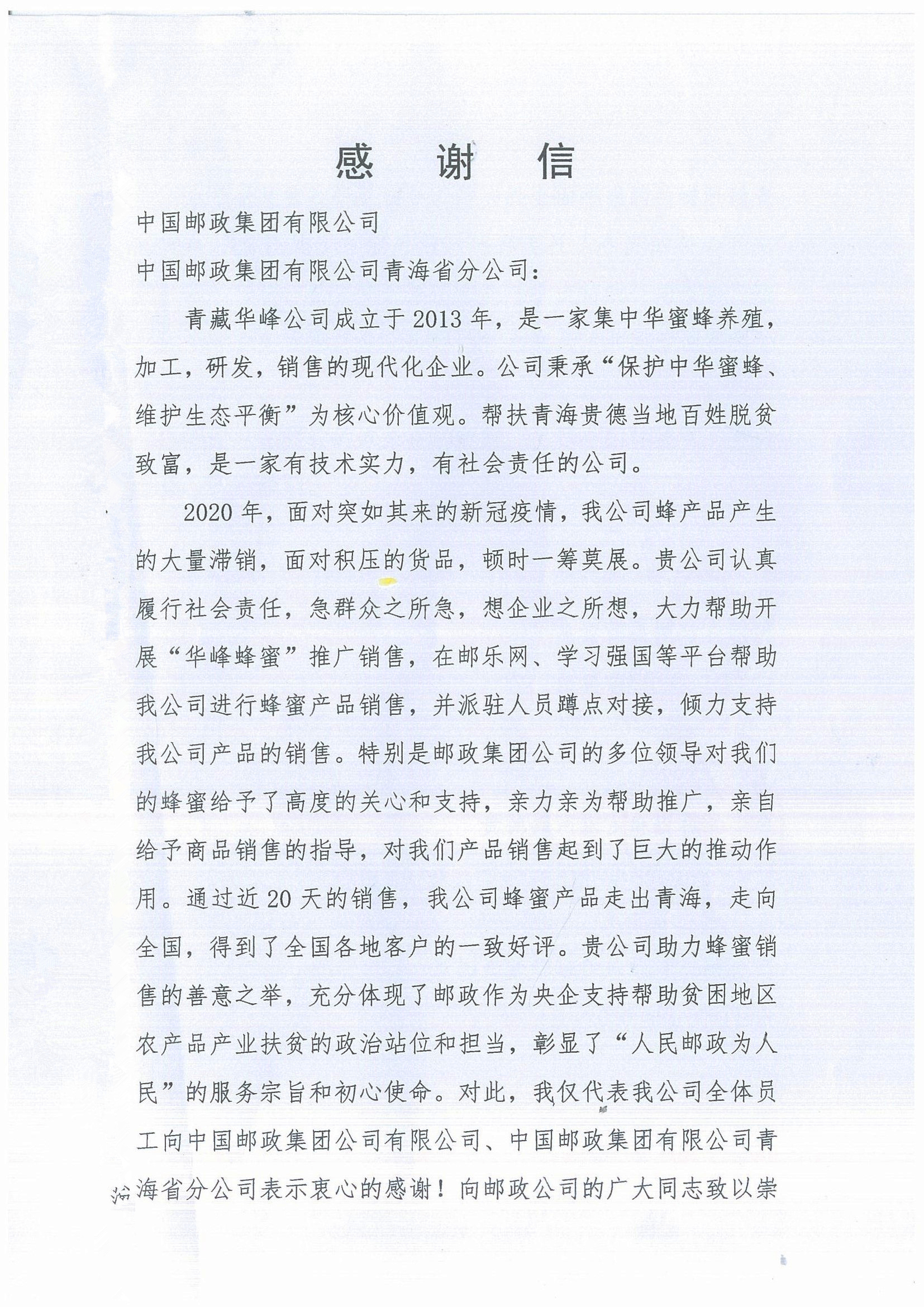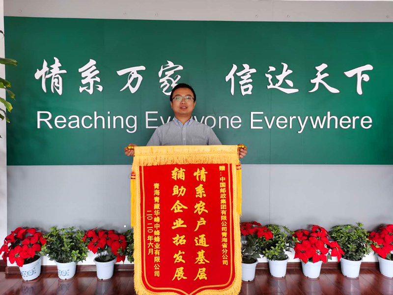 6月10日,青海青藏华峰中蜂蜂业有限公司总经理陈振华将一面写着“情系农户通基层,辅助企业拓发展”的锦旗送到了中国邮政集团有限公司青海省分公司,感谢青海邮政短短一周时间内,帮助他们销售了因疫情滞销的蜂蜜产品,帮助他们走出了困境。