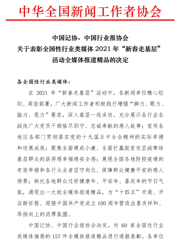 4月23日,中国记协、中国行业报协会发布关于表彰全国性行业类媒体2021年“新春走基层” 活动全媒体报道精品的决定,对60家全国性行业类媒体推荐的157件全媒体报道精品进行通报表彰。《中国邮政报》社的3件作品榜上有名,它们是:《这位邮政小哥凭啥上春晚》(程雪梅、陈颢月、杨佳昕、王勤东、雷浩彬),《家的味道》(吕磊、臧弋萱、张明月、汪尧、杨艳),《走邮路 看中国》(集体)。