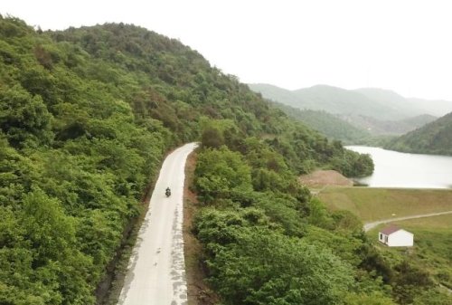 在安徽省巢湖市散兵镇山区里,郑爱军骑行在投递邮件的路上(4月30日无人机拍摄)。