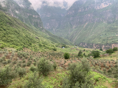 云雾萦绕的山顶上,大片油橄榄林和少许庄稼、蔬菜长势正好,其间错落有致地分布着一间间彝族老百姓村舍,竹墙青瓦,简朴宁静。在最高处,一面鲜艳的党旗迎风飘扬,旁边有一家简易民宿,可供当天实在不能下山的游客小住。远远看去,有村民已在院外翘首以盼,等待某色尔者到来。