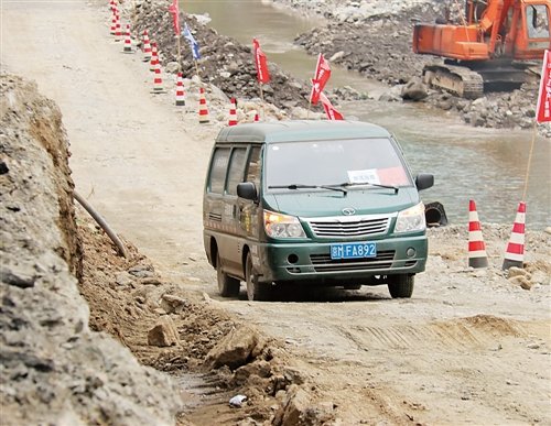 满载救灾物资的邮车正在通过河边临时夯起的土路,马不停蹄地赶往交通不便的北京市房山区蒲洼乡。□本报记者 张晨昱 摄影报道