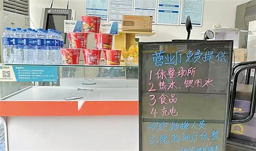 受损较轻的河北省涿州市范阳中路等邮政营业所免费向救援人员、志愿者、受灾群众提供休憩场所和热水、方便食品及手机充电服务。□张宇梅 摄影报道