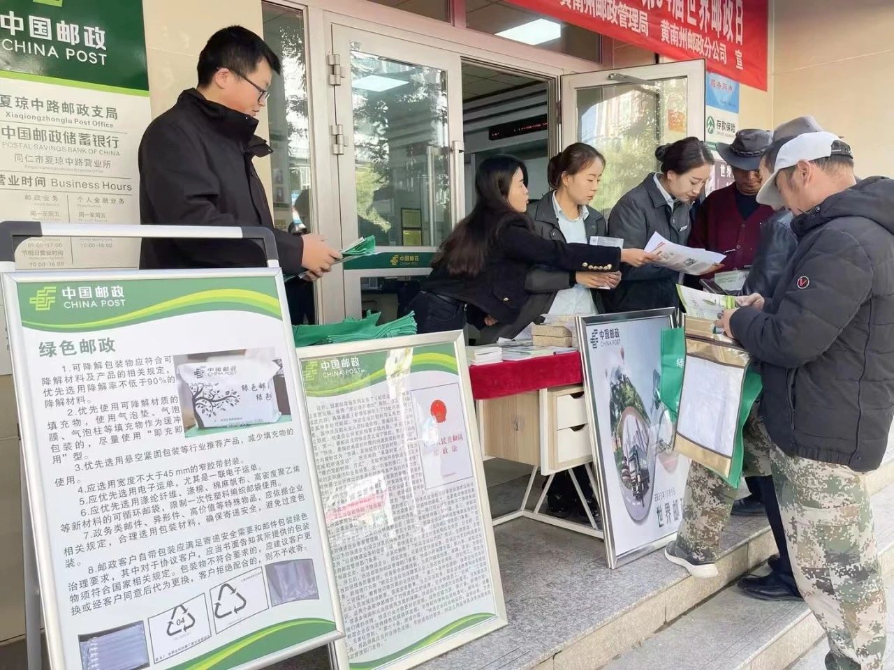 全省邮政各营业网点充分利用邮政自有媒介,在网点LED屏、广告机、液晶电视循环播放世界邮政日宣传海报、宣传视频。各市州分公司结合地域特色,采用厅堂宣传、厅前展示、广场宣传等多种形式宣传企业文化、企业理念和邮政业务,融合金融、寄递、文化传媒、农村电商等业务吸引广大客户踊跃参与,向广大群众宣讲邮政日相关知识,展现邮政服务乡村振兴工作成效,听取客户对邮政服务的意见和用邮需求,全方位、多视角展现了新时代新邮政新形象。
