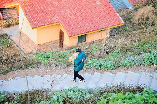 邮政小哥穿梭在蜿蜒的联户路上投递包裹。 □吴敏 摄