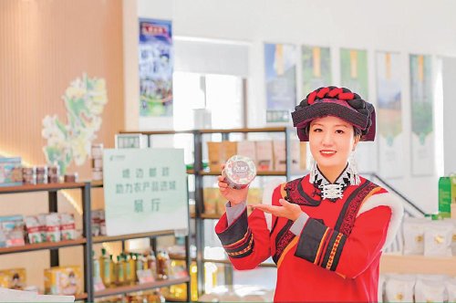 邮政员工直播带货,介绍“彝家新寨”的农特产品。 □吴敏 摄