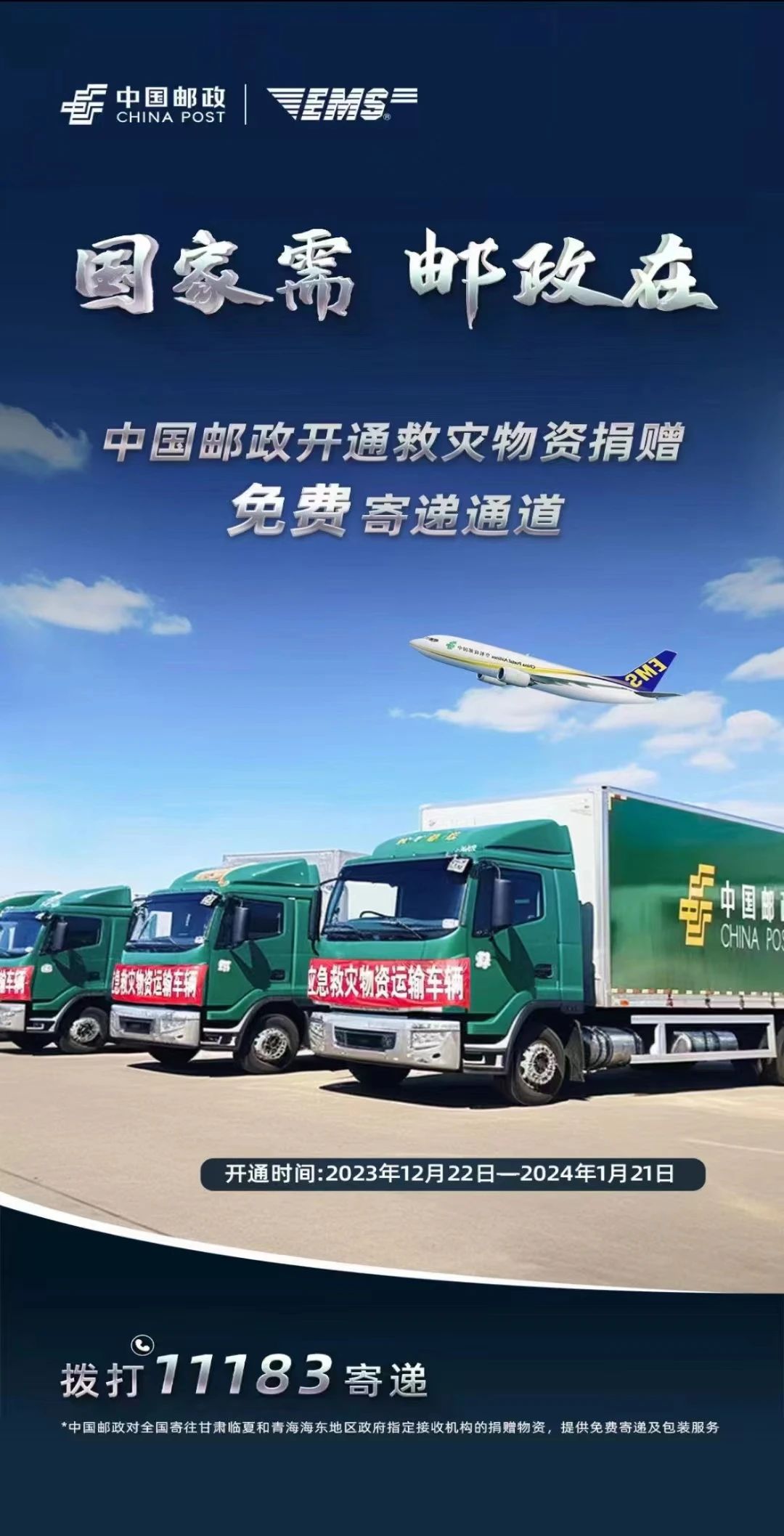 为支援甘肃青海地震灾区抢险救灾 将更多物资及时输送到最需要的地方 中国邮政正式宣布 开通震后救灾捐赠物资 免费寄递绿色通道 您的诚挚爱心 中国邮政免费送达!