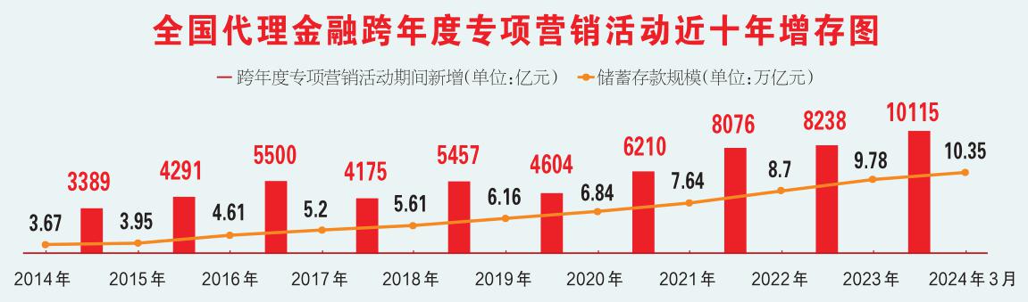 目前,全国邮政代理金融(2023—2024)跨年度专项营销活动已圆满结束,各级机构内外兼修强服务、客户至上增价值、拓客增存增收,取得了显著成效。活动期间,储蓄存款新增10115亿元,其中,价值存款新增10254亿元,价值存款新增占比为101.4%;代发单位新增25448户,代发金额达4072亿元。截至2024年3月末,全国邮政代理金融储蓄存款规模达103529亿元。跨年度专项营销活动成为全国邮政代理金融储蓄存款高位爬坡的“主引擎”,近10次跨年度专项营销活动累计新增储蓄存款59234亿元,今年2月,储蓄存款规模迈上10万亿元历史性新台阶。