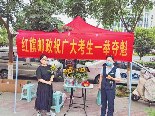 6月7日,河南省新乡市红旗区邮政分公司人民西路支局在高考考点外设置“爱心驿站”,驿站特地准备了橙子和向日葵,祝愿广大考生一举夺魁。考试期间,该支局员工积极向家长介绍邮政金融产品。 □李思雨 摄影报道