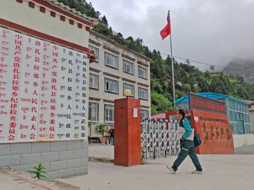 细雨连绵,道路湿滑。一路颠簸,提心吊胆,两个小时后,邮车来到了德玛龙村,藏式的建筑群整齐排列,五星红旗悬挂在每户大门上,沿街墙上张贴着“党的光辉照边疆 边疆人民心向党”等标语。