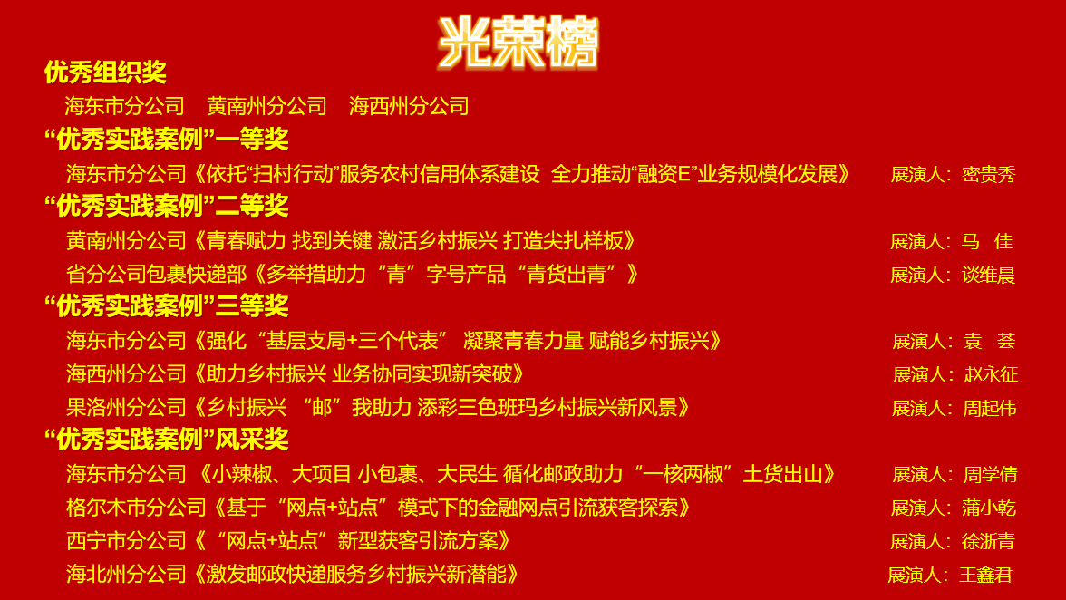 青海邮政“乡村振兴 ‘邮’我助力”青年最佳实践展示大赛活动自4月全面启动以来,在大赛领导小组的领导下,8个办公室成员单位协同配合,通过宣传动员、方案设计、备案发布、实践转化、初评初赛、决赛6大环节,全面推动大赛取得实效。全省各单位对活动给予高度重视、全力参与,党建带团建,强化党建、团青工作与业务深度融合,积极动员组织本单位青年员工,立足岗位,聚焦服务乡村振兴重难点问题,围绕乡村振兴“十大工程”订立转化课题、探索实践路径、提炼展演案例,组织开展初评初赛,累计选拔推荐决赛候选案例21个,经审定10个案例脱颖而出参加决赛。